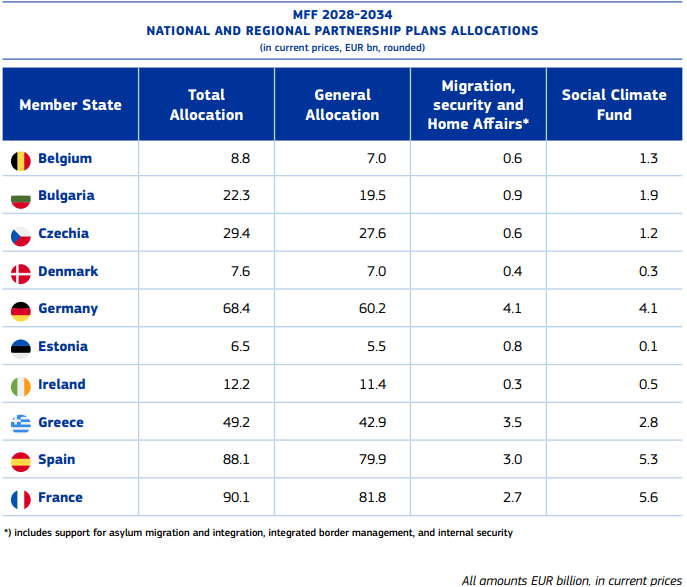 Στην κατανομή της ΕΕ ανά κράτος το ποσό των 49,1 δισ. ευρώ κονδυλίων σε τρέχουσες τιμές που αναλογεί για την Ελλάδα συμπληρώνεται από δαπάνη 3,5 δισ. για δράσεις μετανάστευσης, ασφάλειας και εσωτερικές υποθέσεις. Ακόμη 2,8 δισ. ευρώ προτείνεται να διατεθούν για το κοινωνικό ταμείο για το κλίμα.