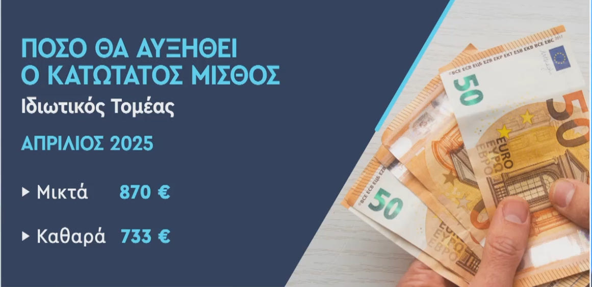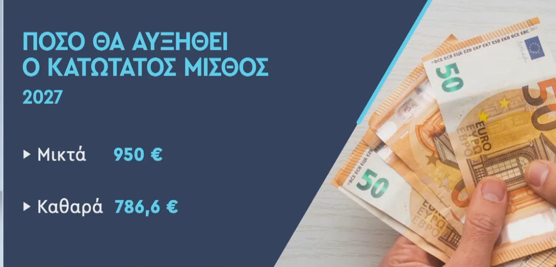 Στον ιδιωτικό τομέα σήμερα ο κατώτατος μισθός είναι μικτά 830 ευρώ και καθαρά 706 ευρώ με την πρόβλεψη αυτά τα ποσά να αυξηθούν αντίστοιχα στα 870 ευρώ (μικτά) και 733 ευρώ καθαρά, με απώτερο στόχο το 2027 να φτάσουν τα 950 ευρώ και τον μέσο μισθό στα 1.500 ευρώ μικτά.