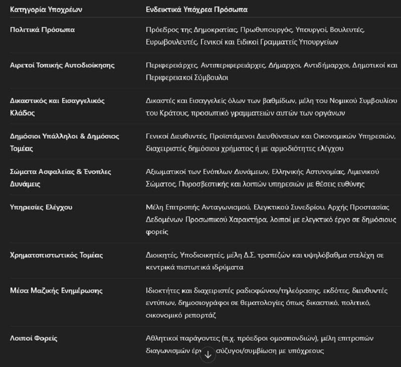 Η υποβολή της δήλωσης Πόθεν Έσχες (Δήλωση Περιουσιακής Κατάστασης) αποτελεί νομική υποχρέωση για ένα ευρύ φάσμα προσώπων στην Ελλάδα, με βάση τον νόμο 5026/2023 και τις τροποποιήσεις του. Ο κύκλος των υπόχρεων έχει διευρυνθεί σημαντικά τα τελευταία χρόνια και περιλαμβάνει πλήθος κατηγοριών από τον δημόσιο, τον πολιτικό, τον δικαστικό, αλλά και τον ιδιωτικό τομέα.