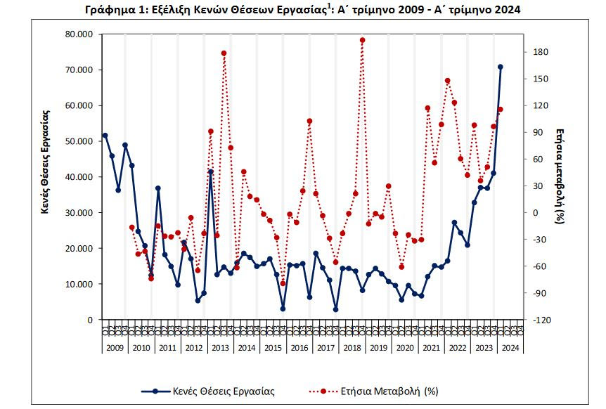 Ο αριθμός των κενών θέσεων εργασίας παρουσίασε αύξηση 115,6% σημείωσε στο σύνολο της οικονομίας, εκτός από τον πρωτογενή τομέα και τις δραστηριότητες των νοικοκυριών, το α’ τρίμηνο εφέτος σε σύγκριση με το α’ τρίμηνο του 2023 (70.826 και 32.850 αντίστοιχα), έναντι αύξησης 97,9% κατά την αντίστοιχη σύγκριση το 2023 προς το 2022.