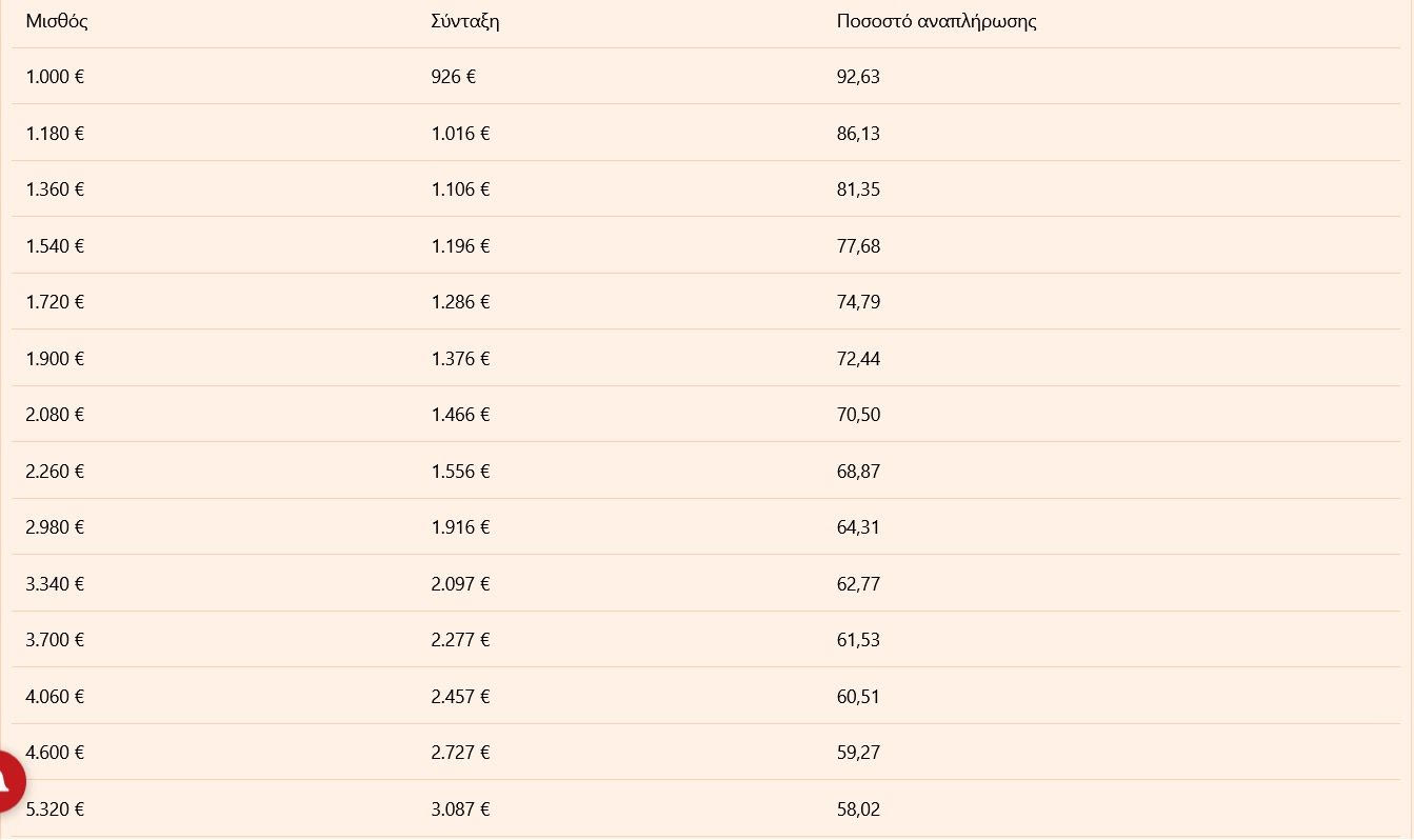 Τα διαφορετικά ποσοστά αναπλήρωσης στις συντάξεις οφείλονται στον συνδυασμό δύο παραγόντων: του μισθού και της εθνικής σύνταξης. Ο μηχανισμός ευνοεί τους χαμηλόμισθους επειδή η εθνική σύνταξη είναι υψηλή για τις αποδοχές τους. Για παράδειγμα, στα 25 έτη ασφάλισης με μισθό 900 ευρώ, οι ασφαλισμένοι παίρνουν τα 426,17 ευρώ της εθνικής σύνταξης και 186 ευρώ από την ανταποδοτική σύνταξη, με το σύνολο να βγαίνει στα 612 ευρώ, που αντιστοιχεί στο 68% του μισθού. Ενώ με μισθό 1.800 ευρώ η εθνική είναι 426,17 ευρώ και η ανταποδοτική 372 ευρώ, με σύνολο 798 ευρώ και αναπλήρωση μισθού από σύνταξη μόλις 44,36%.