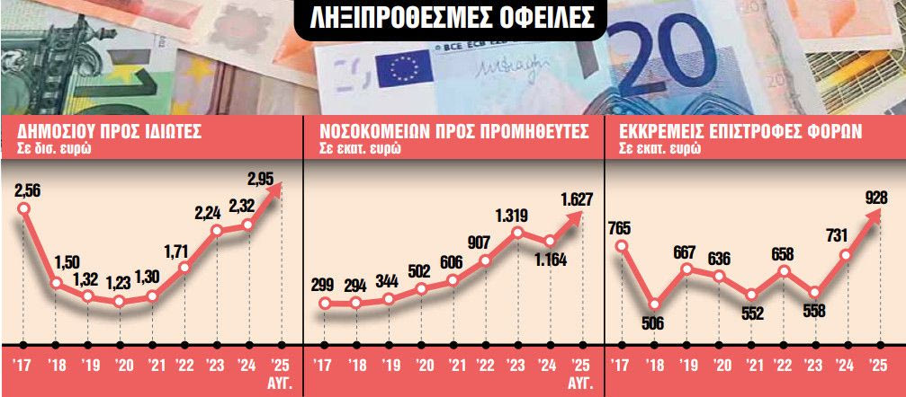 Σύμφωνα με τα τελευταία στοιχεία του Γενικού Λογιστηρίου του Κράτους, τον Αύγουστο του 2025 τα κρατικά φέσια «φούσκωσαν» στα 3,882 δισ. ευρώ από 3,541 δισ. ευρώ τον Ιούλιο του 2025. Στο ποσό περιλαμβάνονται και οι εκκρεμείς επιστροφές φόρων, με αποτέλεσμα μέσα σε μόλις έναν μήνα τα «κρατικά φέσια» να αυξηθούν κατά 341 εκατ. ευρώ. Τα νοσοκομεία και οι εκκρεμείς επιστροφές φόρων συνεχίζουν να κρατούν τα «πρωτεία» των ληξιπρόθεσμων οφειλών.