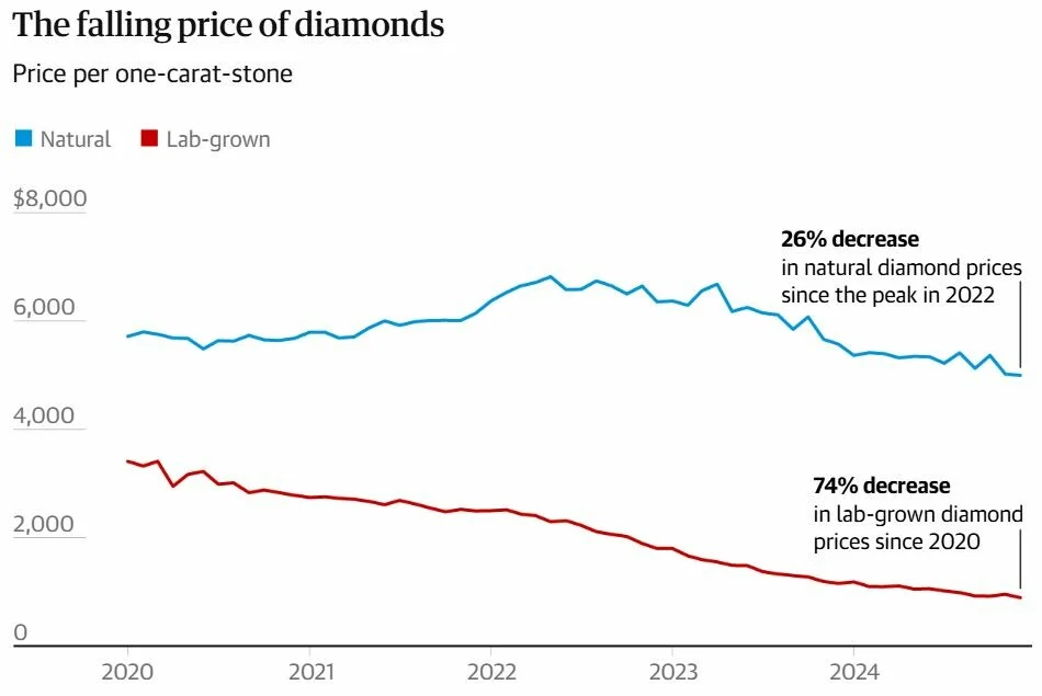 Η De Beers, το μεγαλύτερο όνομα στα διαμάντια, ανέφερε τον περασμένο μήνα ότι ξεκίνησε το 2024 με ένα τεράστιο απόθεμα διαμαντιών 2 δισεκατομμυρίων δολαρίων και δεν είχε καταφέρει να το μετατοπίσει μέχρι το τέλος του έτους. Η εταιρεία μείωσε την παραγωγή στα ορυχεία της κατά 20% και ο ιδιοκτήτης της, Anglo American, την έβαλε προς πώληση.