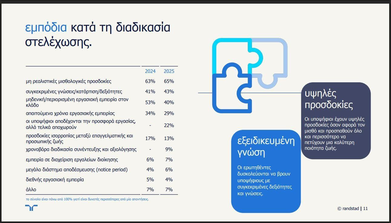 Το 65% των εργοδοτών δηλώνει ότι οι μη ρεαλιστικές μισθολογικές απαιτήσεις των υποψηφίων συνιστούν βασικό εμπόδιο στην κάλυψη θέσεων. Ακολουθούν η έλλειψη κατάλληλων γνώσεων και δεξιοτήτων (43%), και η απουσία σχετικής εμπειρίας στον κλάδο εξειδίκευσης (40%).