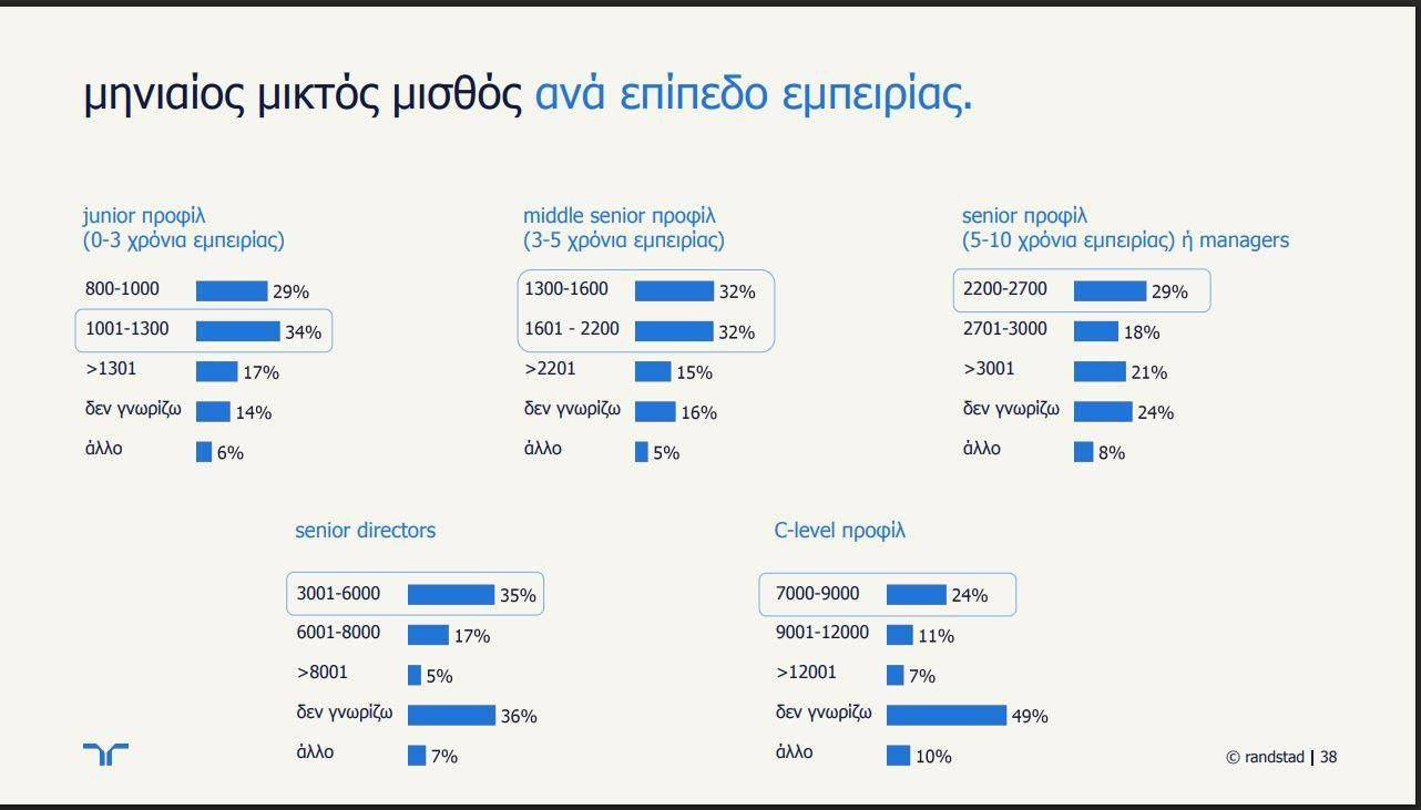 Πάντως η εικόνα των μισθών που αποτυπώνεται στην έρευνα της Randstad είναι πολύ υψηλότερη του μέσου όρου της αγοράς. Για παράδειγμα ένας εργαζόμενος με τρία ως πέντε χρόνια εμπειρίας ξεκινάει από τα 1300 – 1600 ευρώ μικτά, ενώ ο ένας στους τρεις παίρνει από 1601 ως 2200 ευρώ μικτά. Όσοι έχουν προϋπηρεσία πέντε ως δέκα χρόνια, ξεκινάνε από το 2.200 – 2..700 ευρώ, ενώ σχεδόν οι μισοί πληρώνονται από 3000 ευρώ και πάνω.