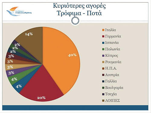 Για τον κλάδο των Τροφίμων & Ποτών, τους κυριότερους αγοραστές αποτελούν η Ιταλία, με τις εξαγωγές να φτάνουν τα 161.8 εκ. ευρώ, η Γερμανία με 82.3 εκ. ευρώ, η Ισπανία με 18,2 εκ. ευρώ, η Πολωνία με 15,4 εκ. ευρώ και στην πέμπτη θέση η Κύπρος με 12 εκ. ευρώ.