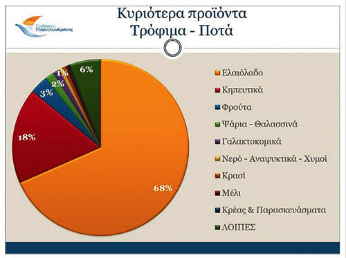 Στον αγροδιατροφικό τομέα, το Ελαιόλαδο έφτασε τα 274,4 εκ. ευρώ, καταλαμβάνοντας το 40% του συνόλου των κρητικών εξαγόμενων προϊόντων και το 68,5% στην κατηγορία των Τροφίμων & Ποτών, με αύξηση 21% σε σχέση με το περυσινό αντίστοιχο διάστημα. Τα Κηπευτικά έφτασαν τα 70,1 εκ. ευρώ με μείωση 1,5%, τα Φρούτα τα 13,5 εκ. ευρώ και μείωση 27,8% και με μικρότερα ποσοστά ακολουθούν τα Ψάρια & Θαλασσινά, τα Γαλακτοκομικά, η κατηγορία των Νερών – Αναψυκτικών – Χυμών, το Κρασί, το Μέλι και το Κρέας & Παρασκευάσματά του.