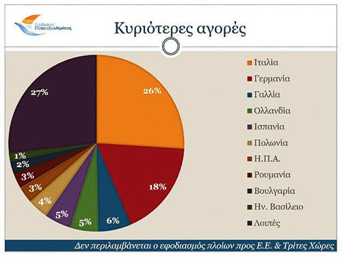 Σχετικά με τις αγορές, οι κυριότεροι αγοραστές των κρητικών προϊόντων είναι η Ιταλία (μερίδιο 26%), η Γερμανία (17,6%), η Γαλλία (6,1%), η Ολλανδία (5,2%) και η Ισπανία (4,9%). Τη δεκάδα των κυριότερων αγοραστών κλείνουν η Πολωνία, οι Η.Π.Α., η Ρουμανία, η Βουλγαρία και το Ηνωμένο Βασίλειο.