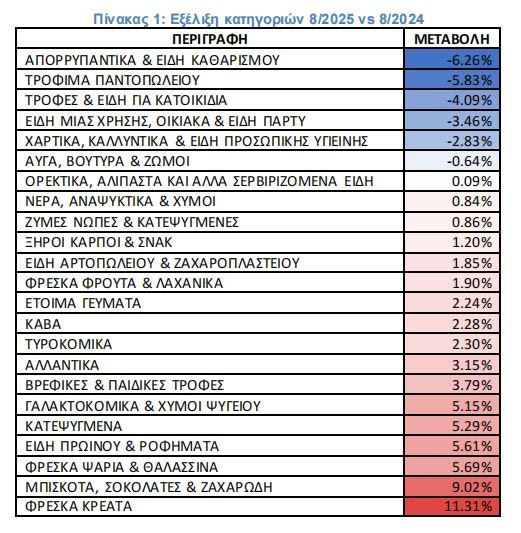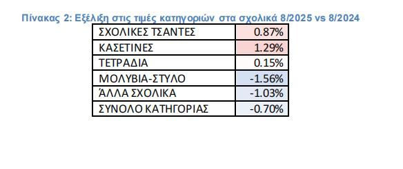 Σε σχέση με τις τιμές των σχολικών ειδών, οι τιμές στα Σουπερμάρκετ τον Αύγουστο 2025 είναι στα ίδια επίπεδα με το 2024, συγκεκριμένα καταγράφεται μικρή μείωση 0,70% μεσοσταθμικά στις σχετικές κατηγορίες. Όπως φαίνεται και στον πίνακα 2, οι διακυμάνσεις στις επιμέρους υποκατηγορίες είναι πολύ μικρές με τη γραφική ύλη να παρουσιάζει μείωση και τα είδη μεταφοράς (τσάντες, κασετίνες) μικρή αύξηση.