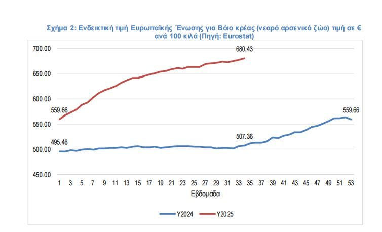 Όπως φαίνεται στο σχήμα 2, την εβδομάδα 34 του 2025 (18-25 Αυγούστου) η τιμή παραγωγού του Βόιου Κρέατος για νεαρό αρσενικό ζώο στην Ευρωπαϊκή Ένωση έχει αυξηθεί κατά 34,1% σε σχέση με την ίδια εβδομάδα το 2024 και 21,58% σε σχέση με την αρχή του 2025, ενώ η τάση παραμένει αυξητική. Σημειώνεται ότι οι μεγάλες εταιρείες του κλάδου είθισται να έχουν ετήσιες συμφωνίες με παραγωγούς και εισαγωγείς προκειμένου να έχουν σταθερές τιμές κάτι που εν μέρει έχει συγκρατήσεις τις τελικές τιμές.