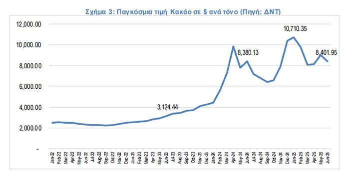 Σε σχέση με την τιμή του κακάο, οι αυξήσεις στις τιμές πρώτων υλών διεθνώς τις τελευταίας 2ετίας λόγω των κλιματικών συνθηκών ήταν πολύ υψηλές. Τον Ιούνιο 2025 καταγράφονται τιμές 168,9% σε σχέση με τον ίδιο μήνα το 2023. Σε σχέση με τον ίδιο μήνα το 2024 οι τιμές είναι σχετικά κοντά, όμως τους προηγούμενες μήνες οι τιμές έφτασαν ακόμα και στις 10,710 δολάρια ανά τόνο, παράλληλα οι τιμές δεν έχουν σταθεροποιηθεί ακόμα. Σημειώνεται ότι λόγω της φύσης των προϊόντων που χρησιμοποιούν κακάο, τα υποπροϊόντα (σοκολάτα) αλλά και τα τελικά προϊόντα (γλυκά) παράγονται σε επόμενους χρόνους με διαφορετικές τιμές.