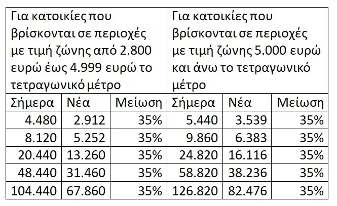 Σήμερα τα παραπάνω ποσά προσαυξάνονται, προκειμένου για κατοικίες που βρίσκονται σε περιοχές με τιμή ζώνης, σύμφωνα με τον αντικειμενικό προσδιορισμό των ακινήτων, από 2.800 ευρώ έως 4.999 ευρώ το τετραγωνικό μέτρο, κατά ποσοστό 40% και για περιοχές με τιμή ζώνης από 5.000 ευρώ και άνω το τετραγωνικό μέτρο, κατά ποσοστό 70%.