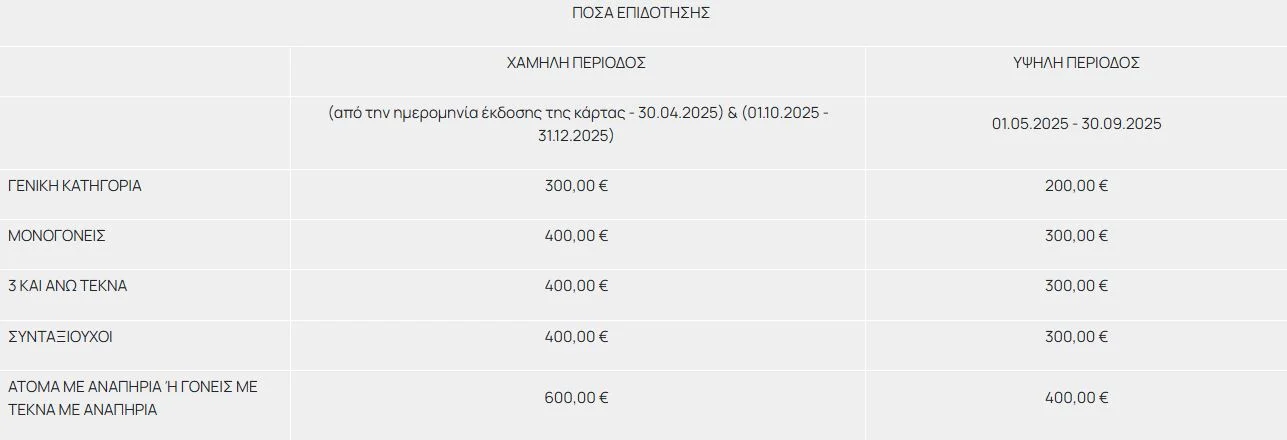 Συγκεκριμένα τα ποσά ενίσχυσης για την Χαμηλή Περίοδο (από την ημερομηνία έκδοσης της κάρτας – 30.04.2025 & 01.10.2025 – 31.12.2025) και την Υψηλή Περίοδο (01.05.2025 – 30.09.2025) διαμορφώνονται ως εξής: