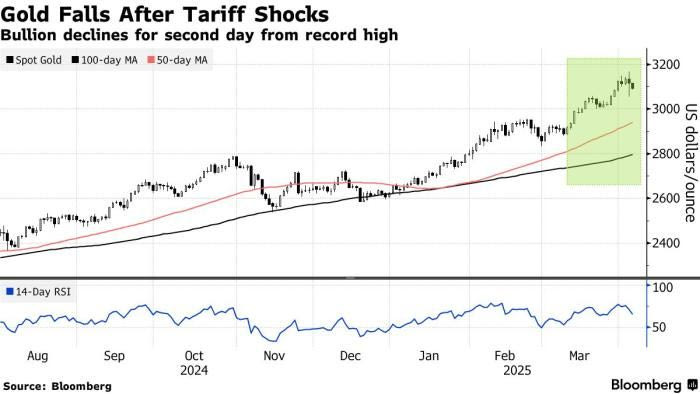 Ο χρυσός απομακρύνθηκε περαιτέρω από το τελευταίο υψηλό ρεκόρ του, παρασυρόμενος από την ανησυχία για τον αντίκτυπο ενός παγκόσμιου εμπορικού πολέμου στον απόηχο της πιο επιθετικής από την αναμενόμενη ατζέντας δασμών του Αμερικανού προέδρου Ντόναλντ Τραμπ.