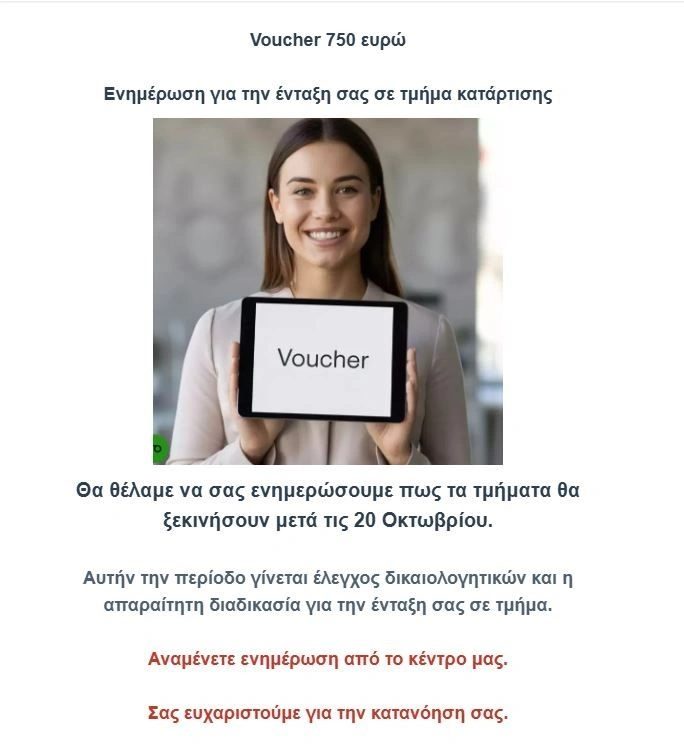 Παρόμοια ενημέρωση απέστειλαν σχεδόν όλα τα κέντρα κατάρτισης, επιβεβαιώνοντας ότι η έναρξη μετατίθεται για τα τέλη Οκτωβρίου, καθώς βρίσκεται σε εξέλιξη η διαδικασία ελέγχου των εγγράφων και ο τελικός σχηματισμός των τμημάτων.