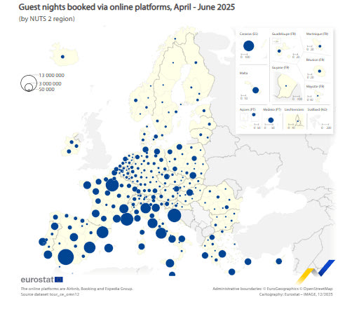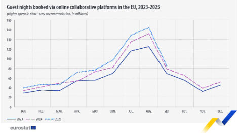 Σύμφωνα με νεότερα στοιχεία της Eurostat, μεταξύ Ιουλίου και Σεπτεμβρίου 2025, οι επισκέπτες διανυκτέρευσαν 398,1 εκατομμύρια διανυκτερεύσεις σε καταλύματα βραχυπρόθεσμης μίσθωσης στην ΕΕ, τα οποία είχαν κρατήσει μέσω των Airbnb, Booking ή Expedia. Ο συνολικός αριθμός διανυκτερεύσεων επισκεπτών κατά το τρίτο τρίμηνο του 2025 αυξήθηκε κατά 8,7 % σε σύγκριση με το αντίστοιχο τρίμηνο του 2024 και κατά 28,2 % σε σύγκριση με το τρίτο τρίμηνο του 2023.