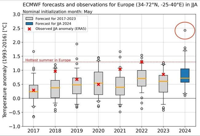 Όπως αναφέρει το meteo τα δεδομένα του ECMWF δείχνουν ότι προβλέπεται ένα από τα πιο θερμά καλοκαίρια των τελευταίων ετών, με μια ακραία τιμή απόκλισης κοντά στο +2.5 ºC. Μάλιστα είναι η πρώτη φορά που κανένα από τα διαθέσιμα προγνωστικά σενάρια τον φετινό Μάιο δεν δείχνει αρνητικές αποκλίσεις θερμοκρασίας για το σύνολο της Ευρώπης.