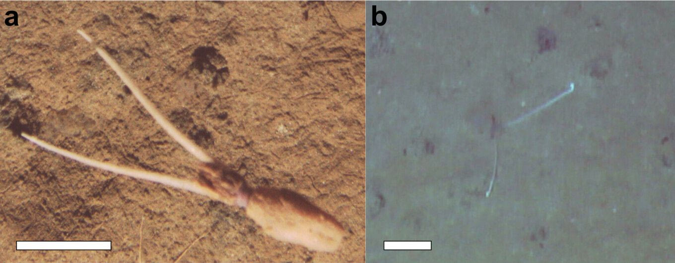(α) Δείγμα που κολυμπά κάθετα προς τον βυθό, καταγεγραμμένο με κάμερα στραμμένη προς τα κάτω. (β) Δείγμα καλυμμένο με μαλακό ίζημα, ακίνητο, με πλοκάμια εκτεταμένα προς τη στήλη νερού, καταγεγραμμένο σε πλάγια λήψη ~4 δευτερόλεπτα πριν από την εικόνα «α»