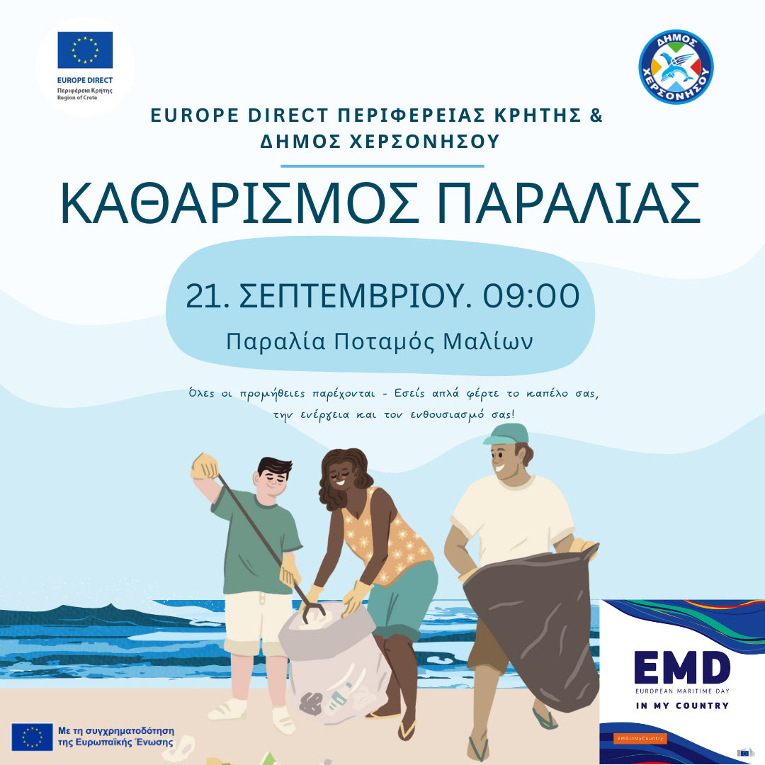 Το Europe Direct της Περιφέρειας Κρήτης και ο Δήμος Χερσονήσου, ως ενεργά μέλη του Ευρωπαϊκού Δικτύου BELC (Building Europe with Local Councillors – Οικοδομώντας την Ευρώπη μαζί με τους εκπροσώπους της τοπικής αυτοδιοίκησης), σας προσκαλούν στη δράση καθαρισμού της παραλίας Ποταμός στα Μάλια, την Κυριακή 21 Σεπτεμβρίου στις 09:00 π.μ., στο πλαίσιο του εορτασμού των Ευρωπαϊκών Ημερών Θάλασσας 2025.