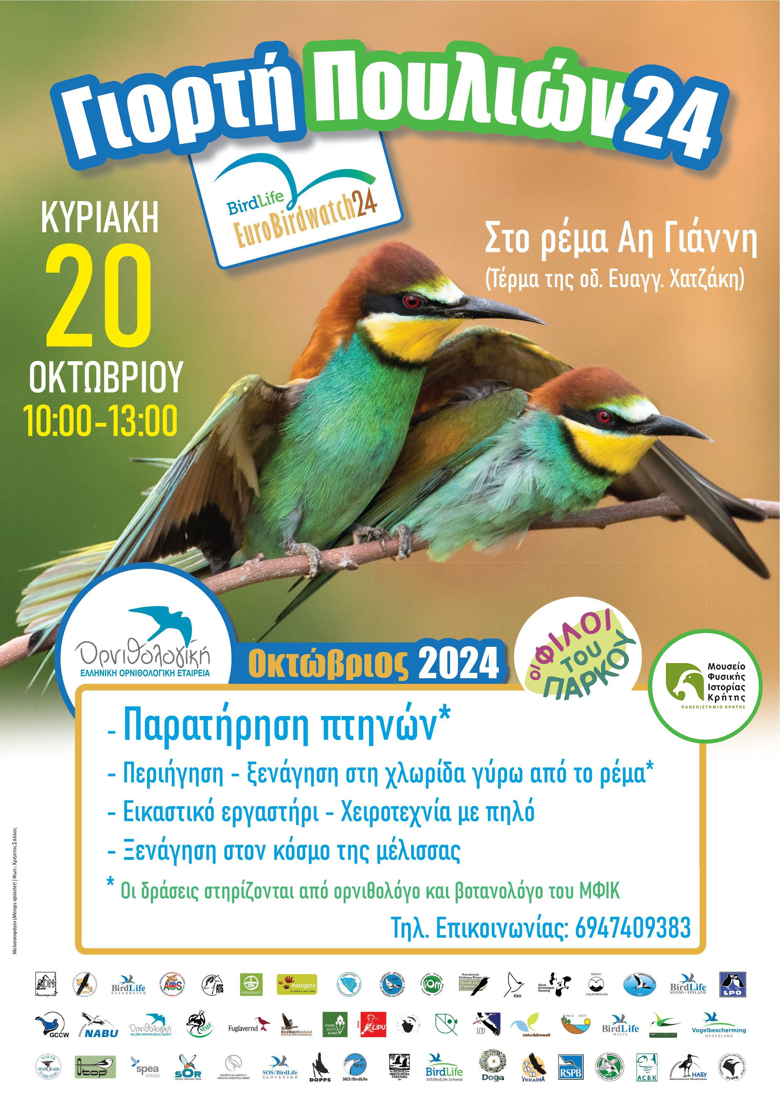 Στο πλαίσιο της διοργάνωσης για την Ευρωπαϊκή Γιορτή Πουλιών (EuroBirdwatch) η ομάδα «Φίλοι του Πάρκου» σε συνεργασία με το Μουσείο Φυσικής Ιστορίας πραγματοποιεί εκδήλωση την Κυριακή 20 Οκτωβρίου 10:00 έως 13:00, στο ρέμα Αη Γιάννη (τέρμα της οδού Ευαγγ. Χατζακη), με δραστηριότητες όπως: παρατήρηση των πτηνών που ζουν στο ρέμα και στην γύρω περιοχή από τον ορνιθολόγο κ. Μιχάλη Δρεττάκη, εικαστικό εργαστήρι χειροτεχνίας, με την κ. Ελενη Κουκουλάκη.