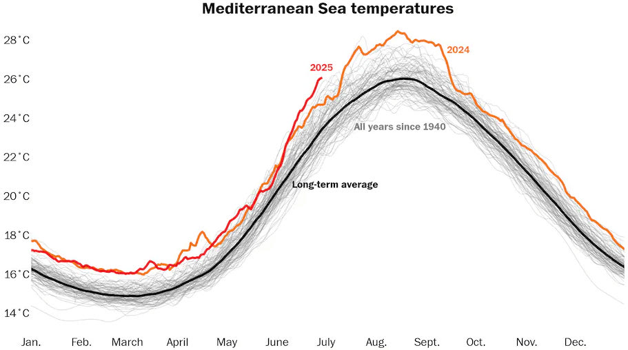 Ένα πλωτό μέσο μέτρησης κοντά στη Μαγιόρκα της Ισπανίας κατέγραψε φέτος θερμοκρασία νερού 31 βαθμούς Κελσίου, ενώ στα ανοικτά της Βενετίας και του Σαν Ρέμο στην Ιταλία το νερό ήταν γύρω στους 30 βαθμούς Κελσίου, σύμφωνα με εκτιμήσεις δορυφόρων.