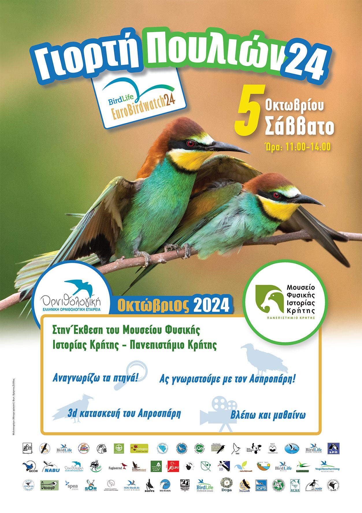 Φέτος, για πρώτη χρονιά, το Μουσείο Φυσικής Ιστορίας Κρήτης συνεργάζεται με την Ελληνική Ορνιθολογική Εταιρεία συμμετέχοντας σε αυτήν την πολύ ξεχωριστή Γιορτή Πουλιών που πραγματοποιείται για περισσότερα από 30 χρόνια με εκδηλώσεις για την ευαισθητοποίηση και την ενημέρωση του κοινού.