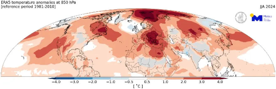 Ο χάρτης που ακολουθεί δείχνει για το τρίμηνο Ιουνίου-Αυγούστου 2024 τη συνολική απόκλιση της θερμοκρασίας στη στάθμη των 1500 μέτρων πάνω από το Βόρειο ημισφαίριο και ο οποίος δείχνει ότι στο μεγαλύτερο μέρος αυτού η μέση θερμοκρασία κινήθηκε πάνω από τα κανονικά για την εποχή επίπεδα.