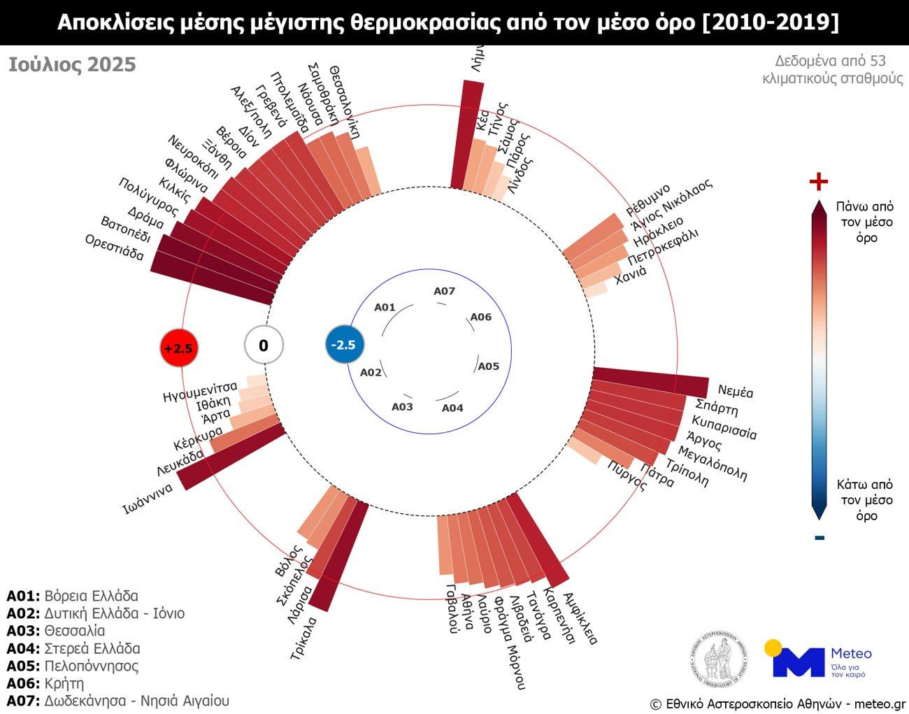 Σύμφωνα με τους 53 μετεωρολογικούς σταθμούς του meteo.gr του Εθνικού Αστεροσκοπείου Αθηνών (ΕΑΑ) που λειτουργούν ανελλιπώς από το 2010 μέχρι σήμερα, τον Ιούλιο του 2025 η μέση τιμή των μεγίστων ημερήσιων θερμοκρασιών κυμάνθηκε πάνω από τα κανονικά για την εποχή επίπεδα σε όλες τις περιοχές της χώρας (σε σχέση με τον μέσο όρο της περιόδου 2010-2019).