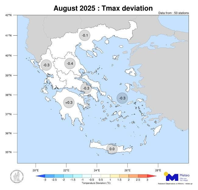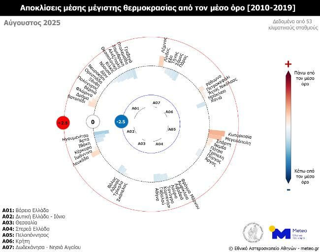 Στον χάρτη του Meteo φαίνονται οι αποκλίσεις της μέσης μέγιστης θερμοκρασίας για τον Αύγουστο του 2025, ανά γεωγραφικό διαμέρισμα.