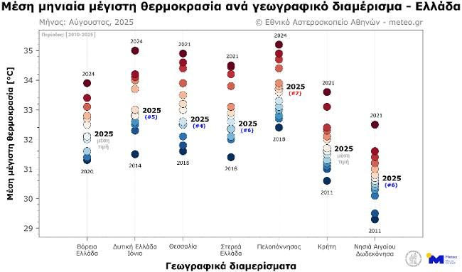 Το επόμενο γράφημα παρουσιάζει την κατάταξη του Αυγούστου ανά έτος, με βάση τη μέση μηνιαία τιμή της μέγιστης θερμοκρασίας. Στη Βόρεια Ελλάδα και την Κρήτη, ο Αύγουστος του 2025 βρέθηκε ακριβώς στα κανονικά για την εποχή επίπεδα, στη Στερεά Ελλάδα και τα Νησιά του Αιγαίου καταγράφηκε ως ο 6ος ψυχρότερος, στη Δυτική Ελλάδα – Ιόνιο και τη Θεσσαλία καταγράφηκε ως ο 5ος και ο 4ος ψυχρότερος αντίστοιχα, ενώ στην Πελοπόννησο ως ο 7ος θερμότερος από το 2010.
