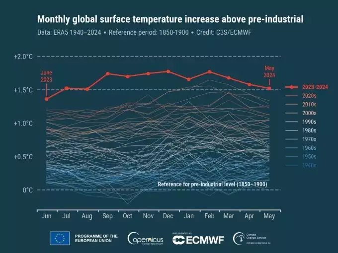Τα στοιχεία του Copernicus είναι ανησυχητικά. H μέση θερμοκρασία των 15,91 βαθμών Κελσίου τον Μάιο του 2024 ήταν κατά 1,52°C υψηλότερη από τον μέσο όρο της περιόδου 1850-1900, δηλαδή πριν από τη βιομηχανοποίηση, σύμφωνα με την υπηρεσία παρακολούθησης του κλίματος της ΕΕ, Copernicus Climate Change Service.