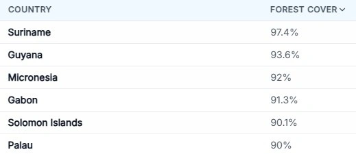 Στην κορυφή της λίστας βρίσκεται το Σουρινάμ και η Γουιάνα στη Νότια Αμερική, η Μικρονησία στον Ειρηνικό, η Γκαμπόν στην Αφρική, τα Νησιά του Σολομώντα και το Παλαού στην Ωκεανία.