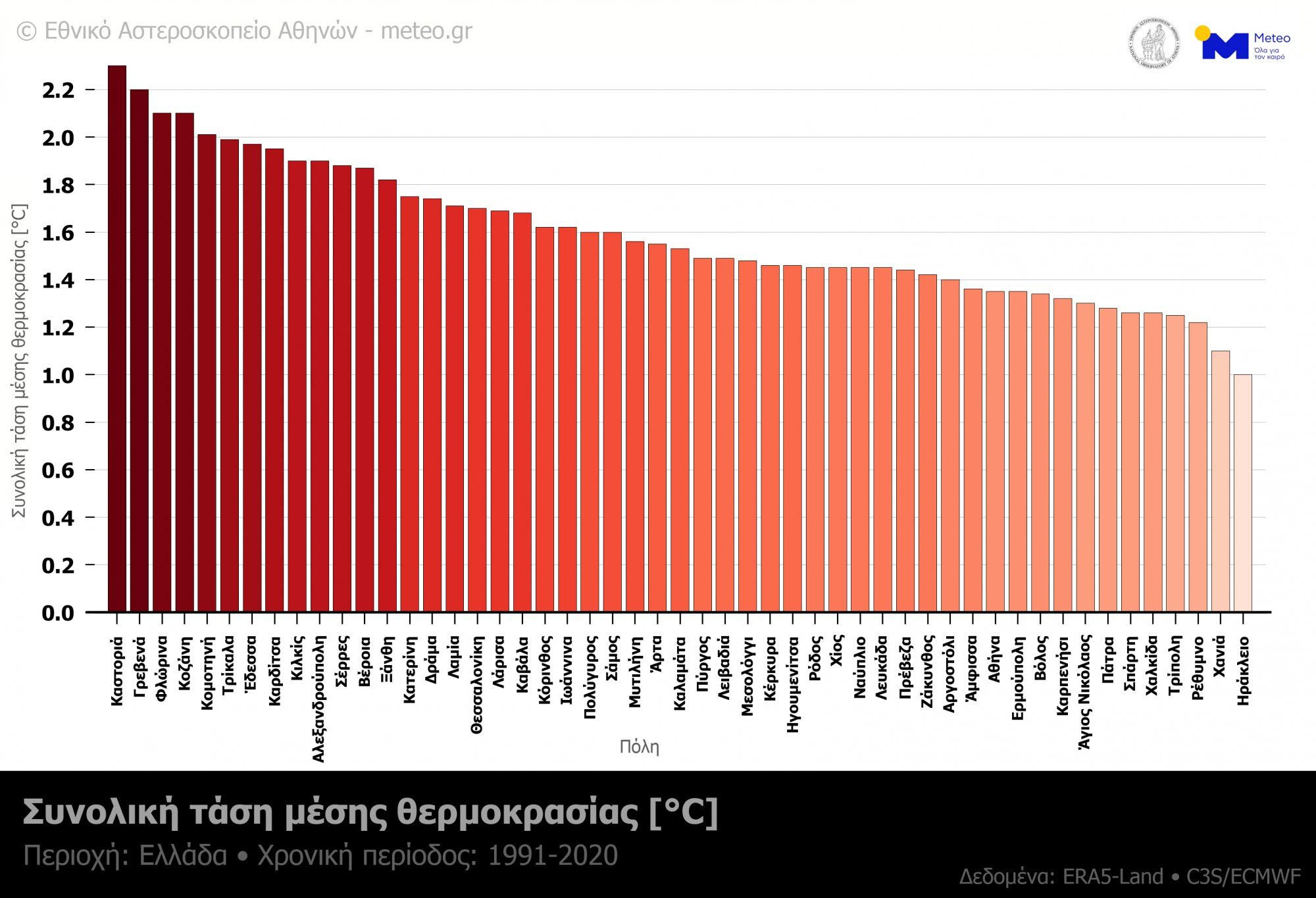 Για σύγκριση, σημειώνουμε ότι στον πλανήτη η μέση θερμοκρασία έχει αυξηθεί 0.6-0.8 °C κατά την ίδια περίοδο, ενώ στη Ευρώπη κατά 1.2 βαθμούς.