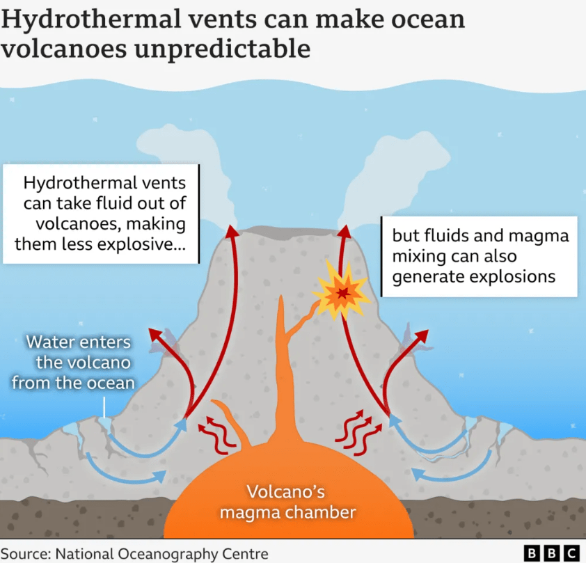 Η τελευταία έκρηξη της Σαντορίνης έγινε το 1950, αλλά μόλις το 2012 υπήρξε μια «περίοδος αναταραχής», λέει η Isobel.Το μάγμα εισήλθε στους θαλάμους των ηφαιστείων και τα νησιά «φούσκωσαν». «Τα υποθαλάσσια ηφαίστεια είναι ικανά για πραγματικά μεγάλες εκρήξεις», λέει.