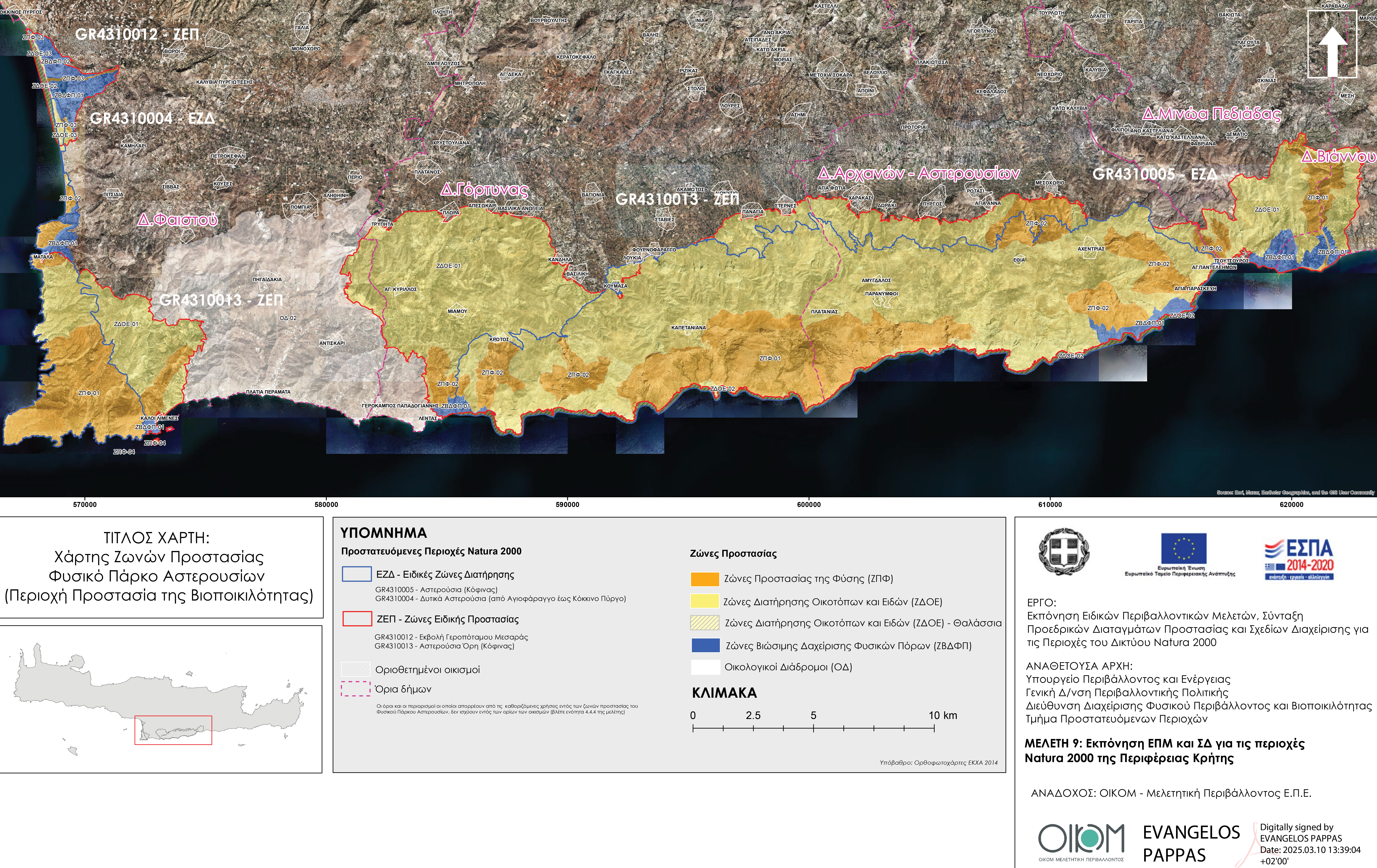 Το έργο ανατέθηκε από το Υπουργείο Περιβάλλοντος, στην εταιρεία «ΟΙΚΟΜ Μελετητική Περιβάλλοντος ΕΠΕ», με εκπρόσωπο τον Ευάγγελο Παππά, ο οποίος εξηγεί, μεταξύ άλλων, ότι η μελέτη «Εκπόνησης Ειδικών Περιβαλλοντικών Μελετών (ΕΠΜ) και Σχεδίων Διαχείρισης (ΣΔ) για τις περιοχές Natura 2000 της Περιφέρειας Κρήτης», αφορά στην εκπόνηση Ειδικών Περιβαλλοντικών Μελετών και Σχεδίων Διαχείρισης για 28 Ειδικές Ζώνες Διατήρησης και 26 Ζώνες Ειδικής Προστασίας του Δικτύου Natura 2000 στην Κρήτη.