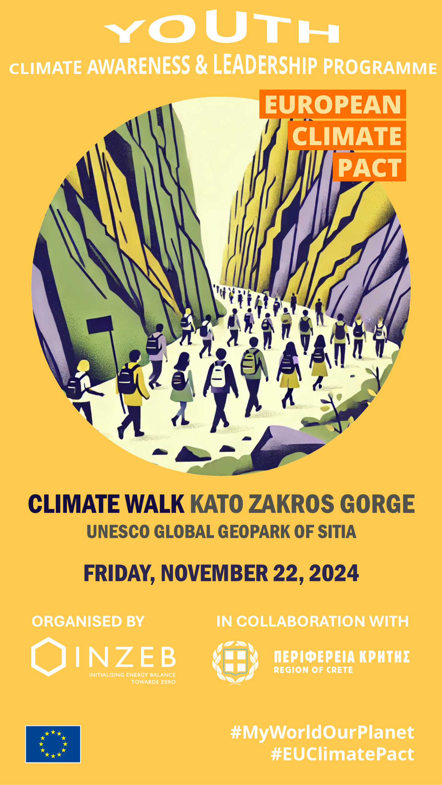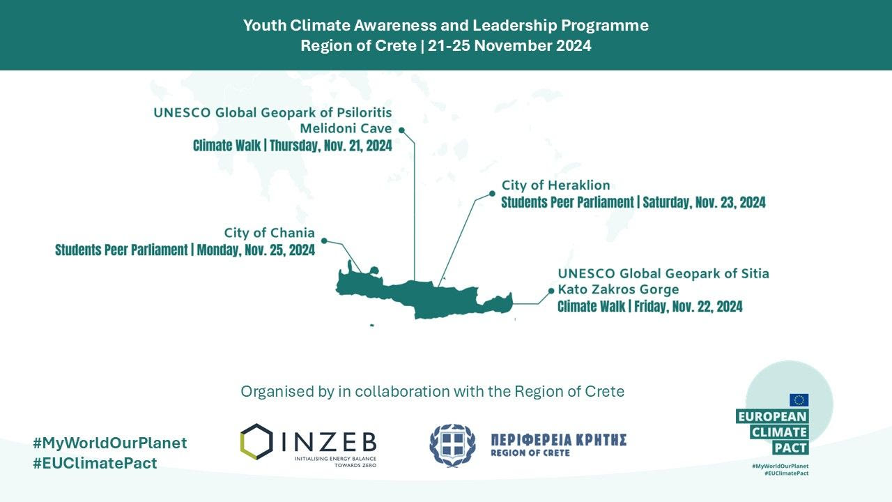 Από τις 21 έως τις 25 Νοεμβρίου, μαθητές και μαθήτριες 12-16 ετών, συμμετέχουν στις δράσεις που περιλαμβάνουν δύο Κλιματικούς Περιπάτους σε Γεώτοπους της UNESCO καθώς και δύο Κλιματικές Συζητήσεις Νέων, στο Ηράκλειο και στα Χανιά.