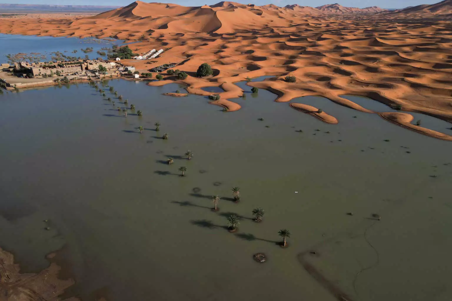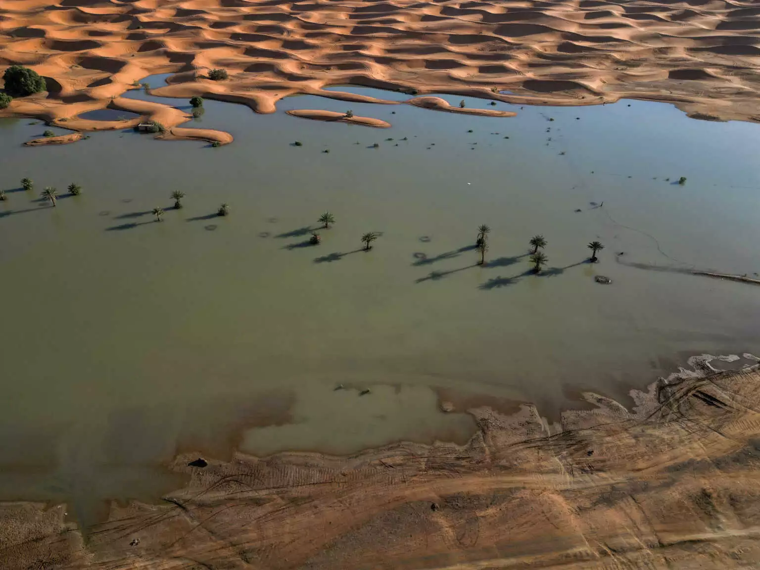 Εικόνες από drone από την έρημο Σαχάρα δείχνουν μεγάλες λίμνες να έχουν σχηματιστεί ανάμεσα σε αμμόλοφους και φοίνικες σε ένα από τα πιο άνυδρα μέρη του κόσμου που πλημμύρισε για πρώτη φορά μετά από δεκαετίες.