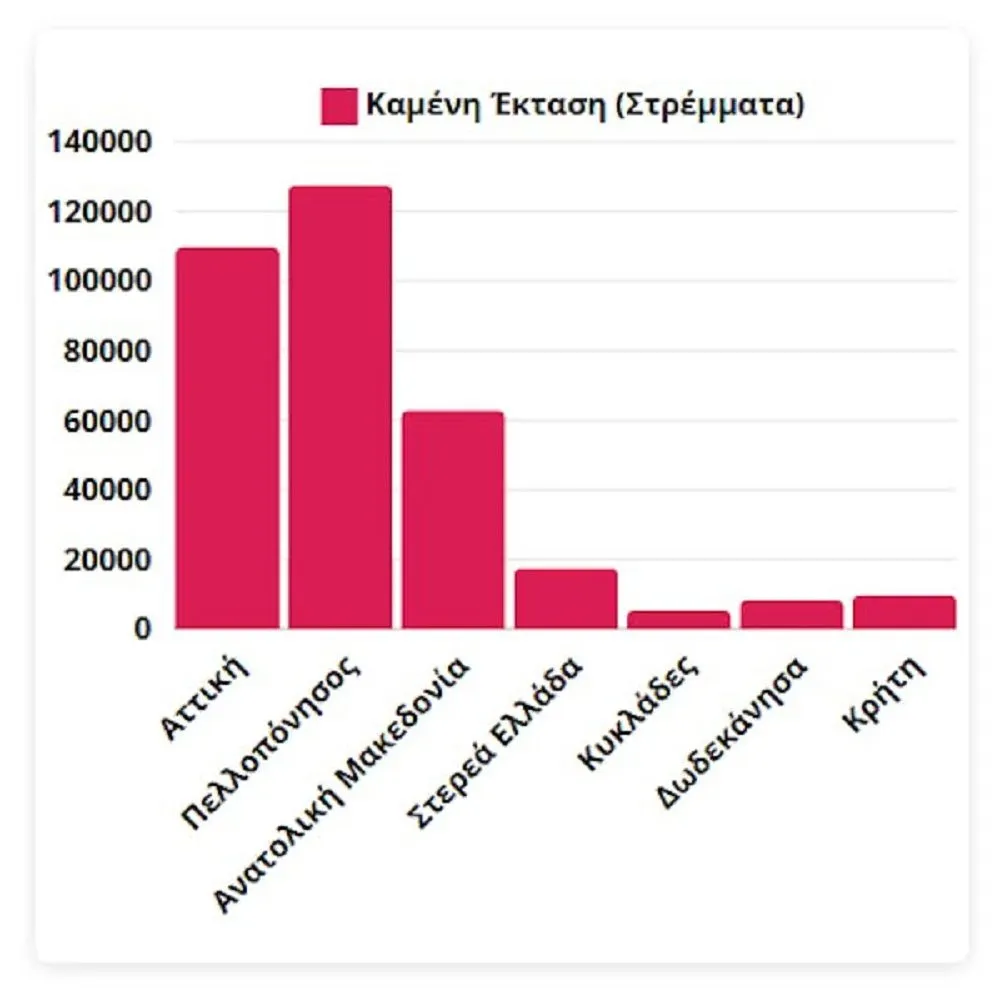 Η πυρκαγιά στη Βορειοανατολική Αττική έπληξε 109.710 στρέμματα, εκ των οποίων τα 90.500 (82,4%) ήταν δασική έκταση, και όχι μόλις τα 10.000 στρέμματα που ακούμε να επαναλαμβάνεται διαρκώς. Σε μόλις 40 ώρες κάηκαν ώριμα δάση που είχαν απομείνει κυρίως στις βόρειες παρυφές του Πεντελικού και τον Μαραθώνα και αυτά ακριβώς αφορούν τα 10.000 στρέμματα στα οποία αναφέρεται συχνά η κυβέρνηση. Εκτός από αυτά, όμως, κάηκαν ξανά πολύτιμες περιοχές με θάμνους, χαμηλή βλάστηση, επίμονη φυσική αναγέννηση και αναδασωτικές προσπάθειες προηγούμενων ετών που, κατά την κυβέρνηση, δεν αποτελούν δάσος και δεν αξίζει να προσμετρηθούν στις δασικές απώλειες. Στην πραγματικότητα όμως, αυτές οι εκτάσεις αποτελούν τις πιο σημαντικές από τις δασικές εκτάσεις που κάηκαν και φέτος. Αντανακλούν αφενός τις προσπάθειες της φύσης να αναγεννήσει το δάσος, και αφετέρου τις προσπάθειες του ανθρώπου, με τεράστιο οικονομικό και διαχειριστικό κόστος, να τη βοηθήσει με τεχνητές αναδασώσεις, όπου χρειάζεται. Όταν αυτές οι περιοχές πλήττονται από αλλεπάλληλες πυρκαγιές χάνουν σταδιακά τη δυνατότητα τους να φιλοξενήσουν οποιαδήποτε δασική βλάστηση και καταλήγουν πετρότοποι, όπως έχει συμβεί τα τελευταία χρόνια σε πάρα πολλές περιοχές της Αττικής και της χώρας γενικότερα.