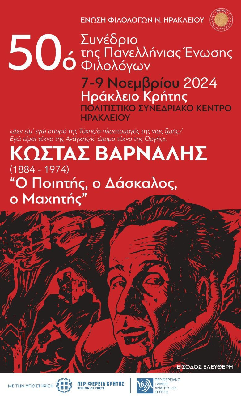 Η Ενωση Φιλολόγων Ν. Ηρακλείου (ΕΦΝΗ) έχει την τιμή να φιλοξενεί οργανωτικά το 50ο Συνέδριο της Πανελλήνιας Ένωσης Φιλολόγων (ΠΕΦ), που είναι αφιερωμένο στον Κώστα Βάρναλη και θα διεξαχθεί στο Ηράκλειο Κρήτης, 7 – 9 Νοεμβρίου 2024 , στο Πολιτιστικό Συνεδριακό Κέντρο Ηρακλείου (ΠΣΚΗ), Πλαστήρα & Ρωμανού.