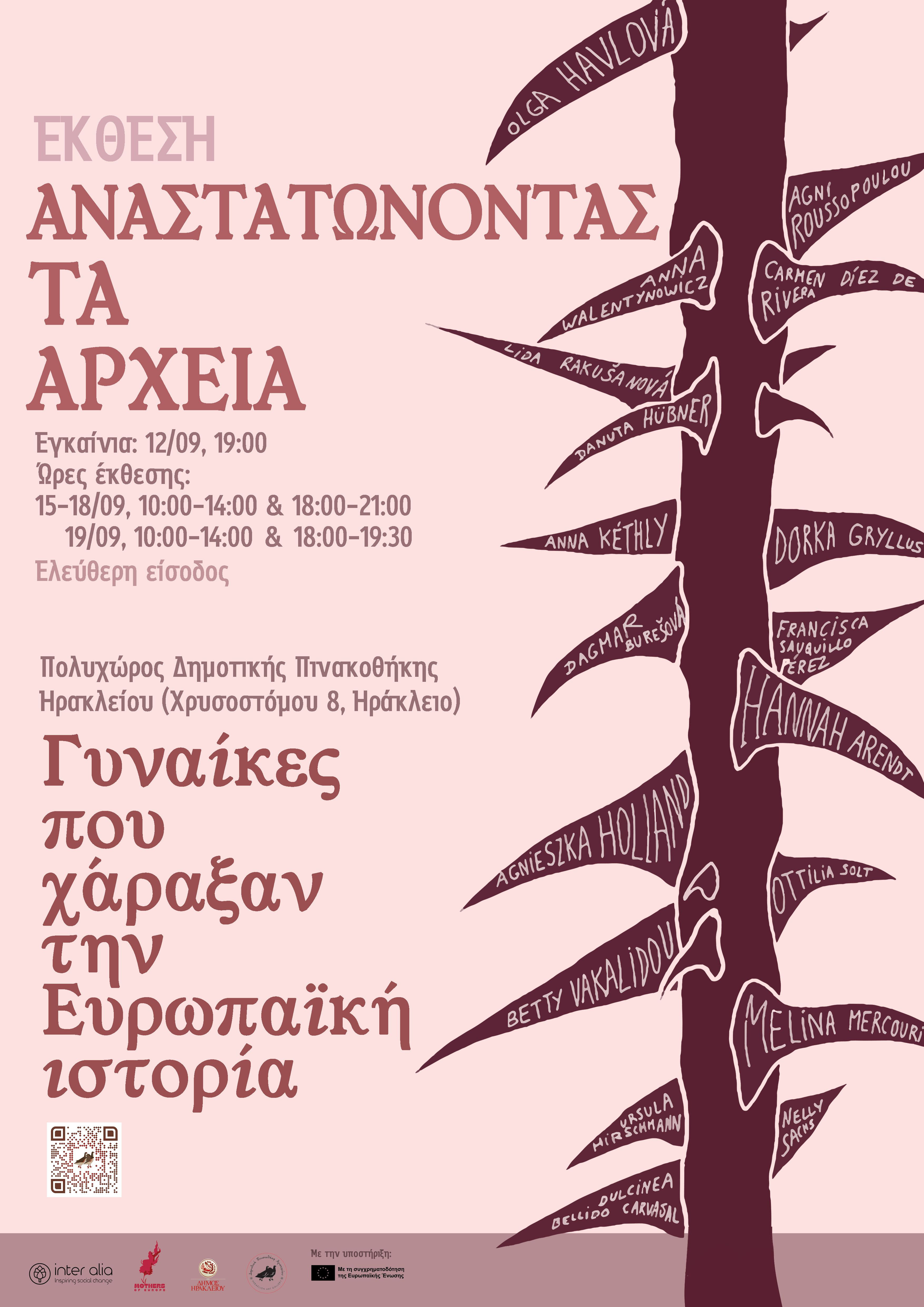 Η πολυμεσική έκθεση αρχείων με τίτλο «Αναστατώνοντας τα αρχεία: Γυναίκες που χάραξαν την Ευρωπαϊκή ιστορία», ανοίγει τις πύλες την Παρασκευή 12 Σεπτεμβρίου στις 19:00 το απόγευμα στον Πολυχώρο της Δημοτικής Πινακοθήκης Ηρακλείου (Χρυσοστόμου 8). Η έκθεση θα διαρκέσει έως 19 Σεπτεμβρίου.