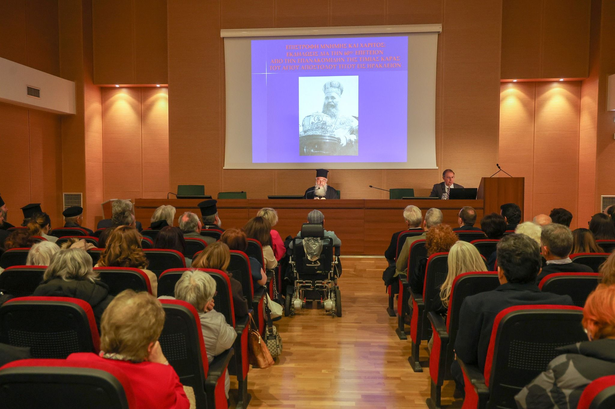 Το θέμα της ομιλίας είχε τίτλο: «Επιστροφή μνήμης και χάριτος: 60 χρόνια από την επανακομιδή της Τιμίας Κάρας του Αποστόλου Τίτου», κι έλαβε χώρα στις «Μικρές Ιστορίες της Πόλης», στην αίθουσα «Δομήνικος Θεοτοκόπουλος» της Βικελαίας Δημοτικής Βιβλιοθήκης, το απόγευμα της Τετάρτης 18/2.
