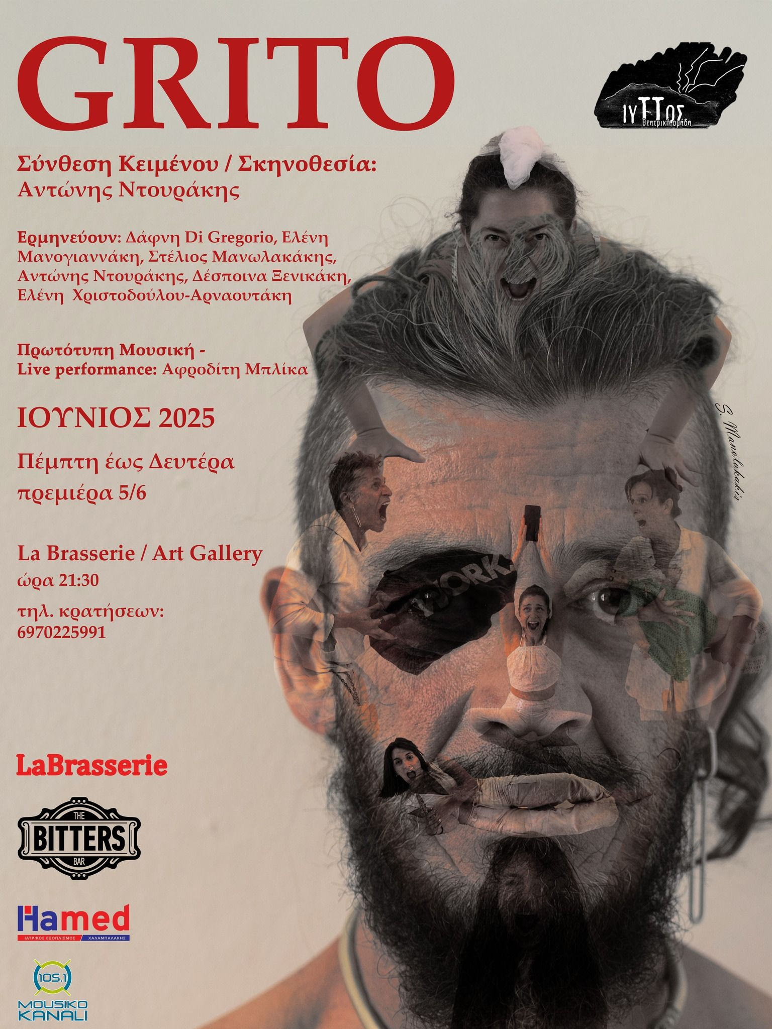Η παράσταση ‘’GRITO’’, θα κάνει πρεμιέρα την Πέμπτη 5 Ιουνίου στις 9.30 το βράδυ, στο χώρο του La Brasserie / Art Gallery, στις 9.30 το βράδυ. Θα παρουσιάζεται κάθε εβδομάδα από Πέμπτη έως Δευτέρα. Σύνθεση κειμένου – σκηνοθεσία: Αντώνης Ντουράκης. Ερμηνεύουν: Δάφνη Di Gregorio, Ελένη Μανογιαννάκη, Στέλιος Μανωλακάκης, Αντώνης Ντουράκης, Δέσποινα Ξενικάκη, Ελένη Χριστοδούλου – Αρναουτάκη. Πρότυπη μουσική – live performance: Αφροδίτη Μπλίκα.