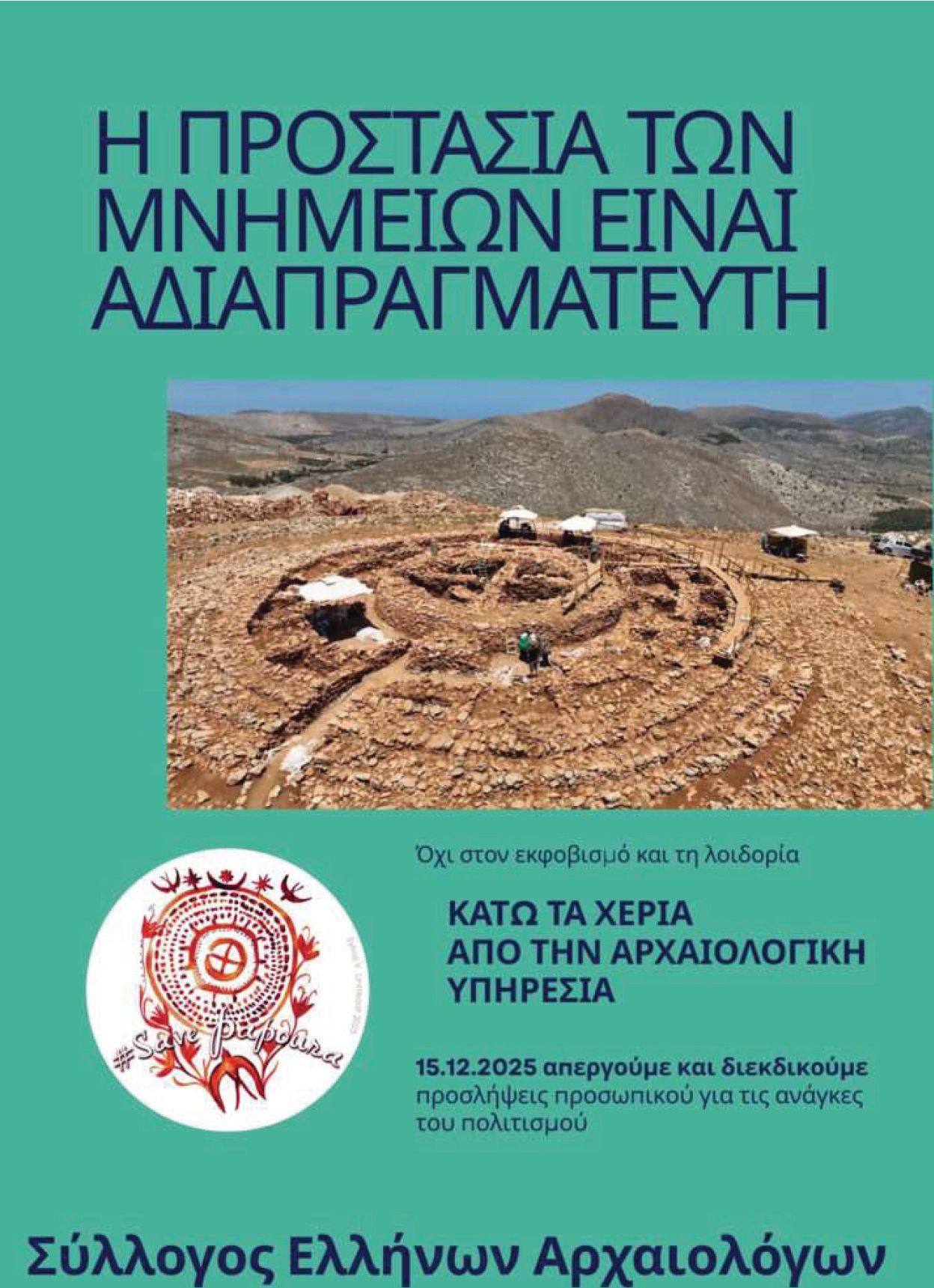 «Θέλουμε να σταματήσει ο εργασιακός εκφοβισμός σε όλες τις Υπηρεσίες» και «να γίνει κατανοητό ότι κάθε φορά που η Βουλή ψηφίζει νόμους που μας αυξάνουν την εργασιακή ύλη, θα πρέπει να προσλαμβάνεται και το αντίστοιχο προσωπικό στην Αρχαιολογική Εφορεία».