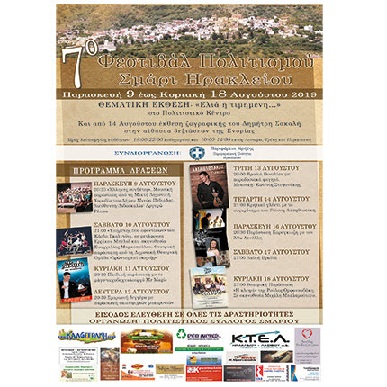 Ο Πολιτιστικός Σύλλογος Σμαρίου, το Τοπικό Συμβούλιο και το Ενοριακό Συμβούλιο, με τη στήριξη της Περιφέρειας Κρήτης-ΠΕ Ηρακλείου, διοργανώνουν το «7ο Φεστιβάλ Πολιτισμού», το οποίο θα διαρκέσει από τις 9 Αυγούστου έως στις 18 Αυγούστου. Στo πλαίσιo του fεστιβάλ, θα λειτουργεί η έκθεση «Ελιά η τιμημένη…» στο Πολιτιστικό Κέντρο Σμαρίου και έκθεση ζωγραφικής του Δημήτρη Σακαλή στην αίθουσα δεξιώσεων της Ενορίας. Παράλληλα θα πραγματοποιούνται ποικίλες δραστηριότητες με ελεύθερη είσοδο για το κοινό.