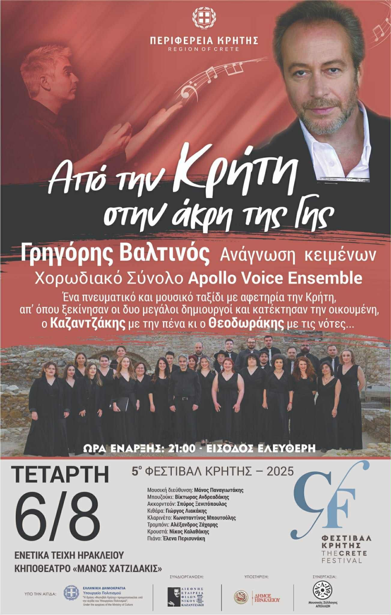 Στο πλαίσιο του 5ου Φεστιβάλ Κρήτης, η Περιφέρεια Κρήτης σε συνεργασία με την Διεθνή Εταιρία Φίλων Νίκου Καζαντζάκη, παρουσιάζουν τη μουσική εκδήλωση «Από την Κρήτη στην άκρη της γης», αύριο Τετάρτη 6 Αυγούστου 2025 στο Κηποθέατρο «Μάνος Χατζιδάκις» στις 9 το βράδυ με ελεύθερη είσοδο.