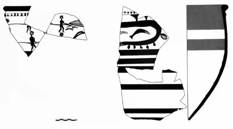 Μια σκηνή που απεικονίζει ψάρεμα με δίχτυ, ζωγραφισμένη σε θραύσμα κρατήρα από τη Μέση Υστεροελλαδική ΙΙΙΓ περίοδο, ο οποίος βρέθηκε στον Κύνο (Ανατολική Λοκρίδα). Πηγή: Δακρώνια, Κουνούκλας 2015
