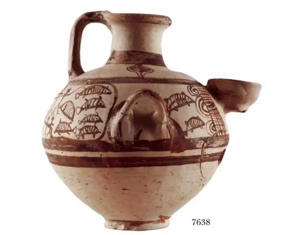 Μια υδρία από τη μέση φάση της Υστεροκυκλαδικής ΙΙΙγ περιόδου (υδρία με ηθμοειδή λαιμό) διακοσμημένη με σκηνή ψαρέματος με δίχτυ, η οποία βρέθηκε σε τάφο στα Απλώματα της Νάξου. Πηγή: Βλαχόπουλος 2006