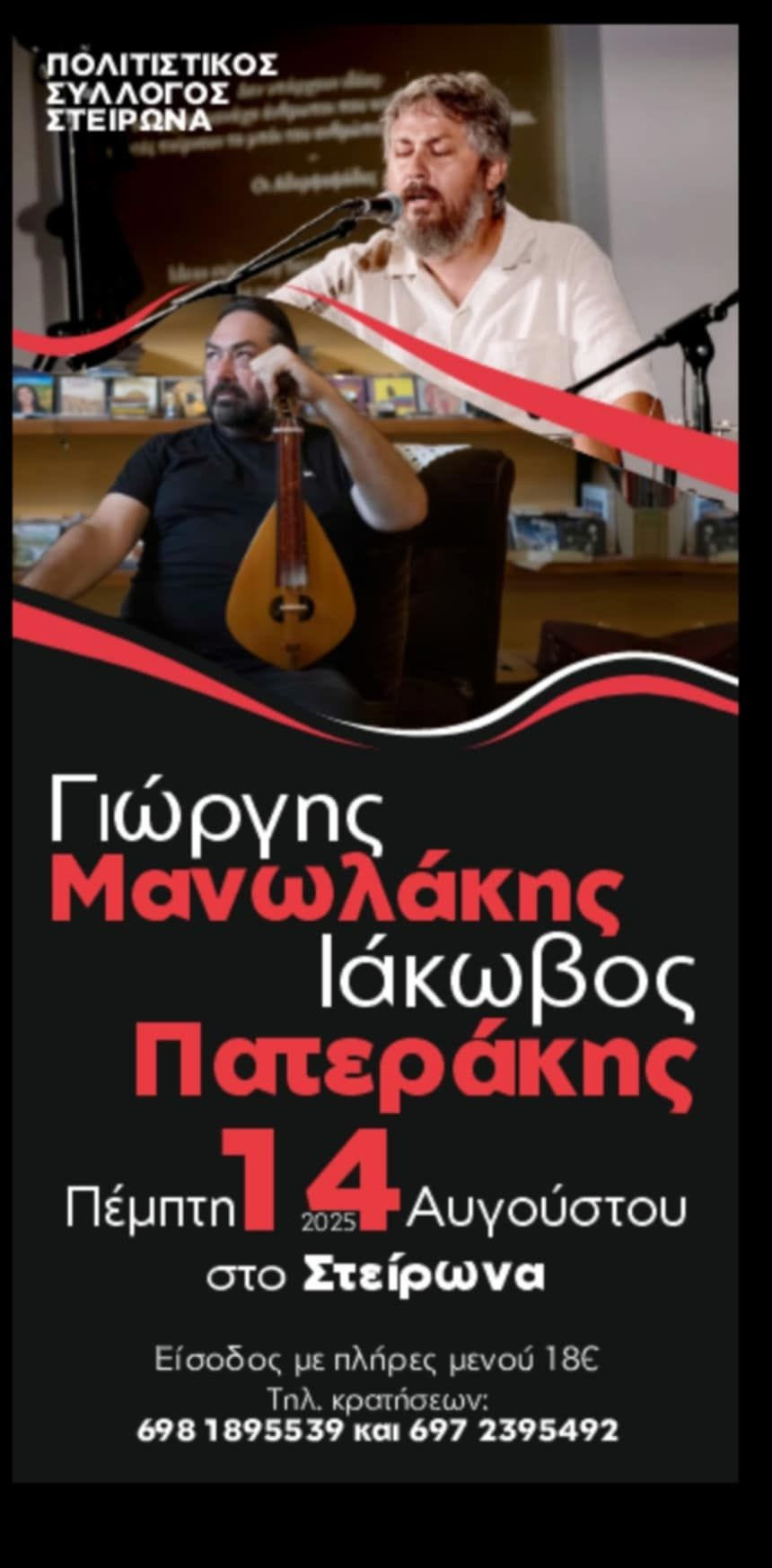 Την παραμονή της εορτής, την Πέμπτη 14 Αυγούστου 2025, ο Πολιτιστικός Σύλλογος Στείρωνα διοργανώνει στον αύλειο χώρο του ναού μια ξεχωριστή κρητική μουσική βραδιά, συνδέοντας την πίστη με τη χαρά της παράδοσης. Στη σκηνή θα βρεθούν καταξιωμένοι καλλιτέχνες της κρητικής μουσικής: