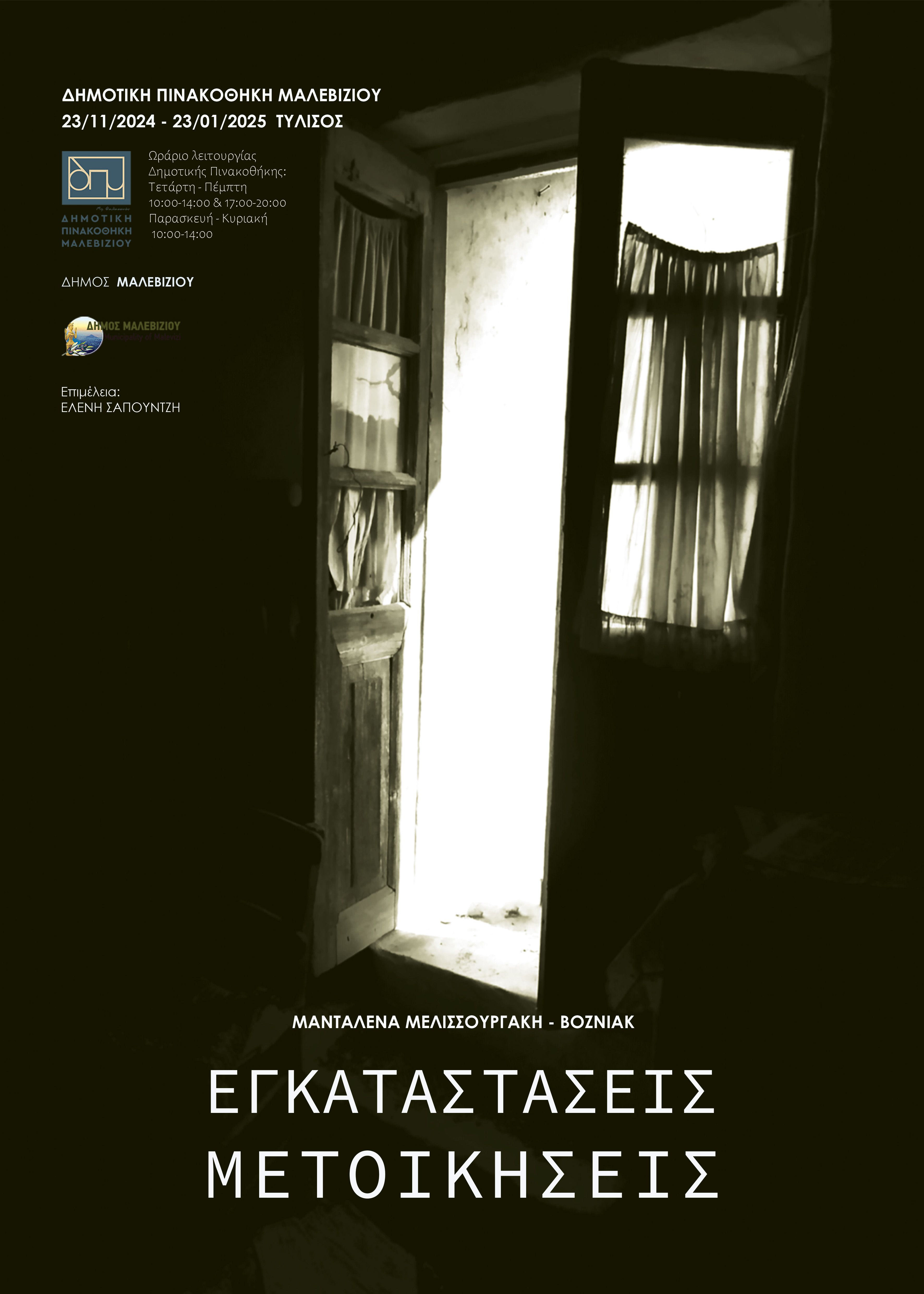 Σήμερα στις 18.30 θα πραγματοποιηθούν στη Δημοτική Πινακοθήκη Μαλεβιζίου τα εγκαίνια της έκθεσης της εικαστικού Μανταλένας Μελισσουργάκη-Βόζνιακ «Εγκαταστάσεις-Μετοικήσεις».
