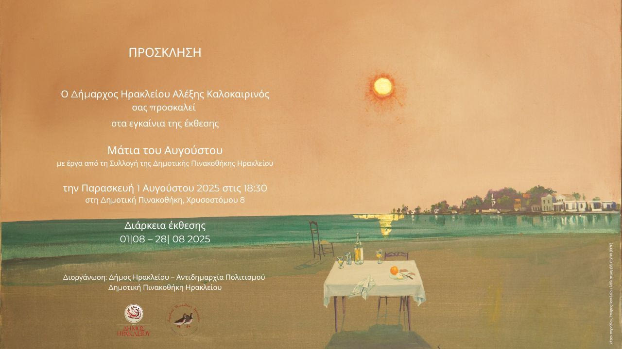 Με 60 έργα ζωγραφικής και χαρακτικής από την Συλλογή της, η Δημοτική Πινακοθήκη Ηρακλείου υποδέχεται τον Αύγουστο με μία θεματική έκθεση με τίτλο Μάτια του Αυγούστου. Την έκθεση θα εγκαινιάσει ο Δήμαρχος Ηρακλείου Αλέξης Καλοκαιρινός, σήμερα στις 18:30 το απόγευμα στον Πολυχώρο της Δημοτικής Πινακοθήκης Ηρακλείου (Χρυσοστόμου 8).